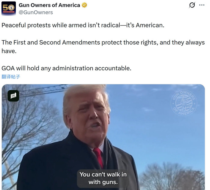 “持枪和平抗议并非是极端的,这符合美国方式,第一修正案和第二修正案都保护这些权利,这是一个可以追溯到波士顿倾茶事件延续而来的美国历史传统。”他强调。