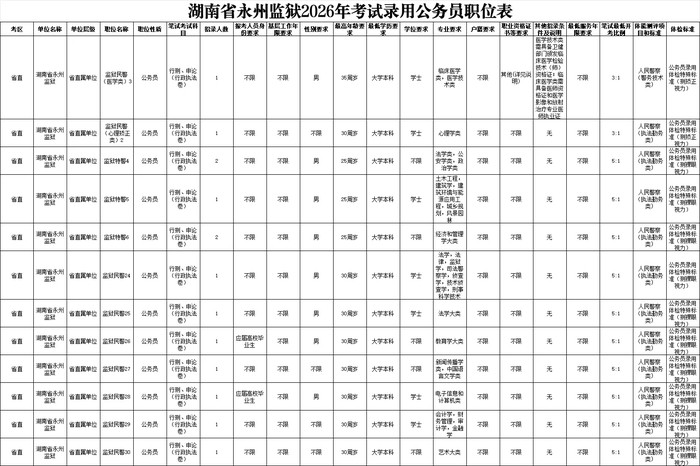 新黄河记者注意到,不少网友质疑此举是否为专设的“萝卜岗”。在1月17日,湖南省永州监狱公众号发布的《湖南省永州监狱2026年考试录用公务员职位表》显示,此次该监狱招录12个岗位,总计14人,职位名称均为监狱民警或监狱特警,专业要求涵盖临床医学类、法学类、电子信息和计算机类等多个专业,也确有一个监狱民警岗位的招录名额,专业要求为“艺术大类”。