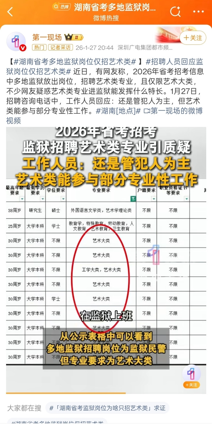 近日,有网友称,2026年湖南省考多地监狱岗位招聘艺术类专业,且仅限艺术大类,不少网友疑惑艺术类专业进监狱能发挥什么特长,还有人质疑为“萝卜岗”。
