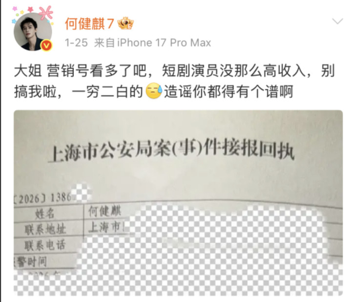 当日,何健麒回应称“大姐,营销号看多了吧,短剧演员没那么高收入,别搞我啦,一穷二白的,造谣你都得有个谱啊”。其工作室称已报案。