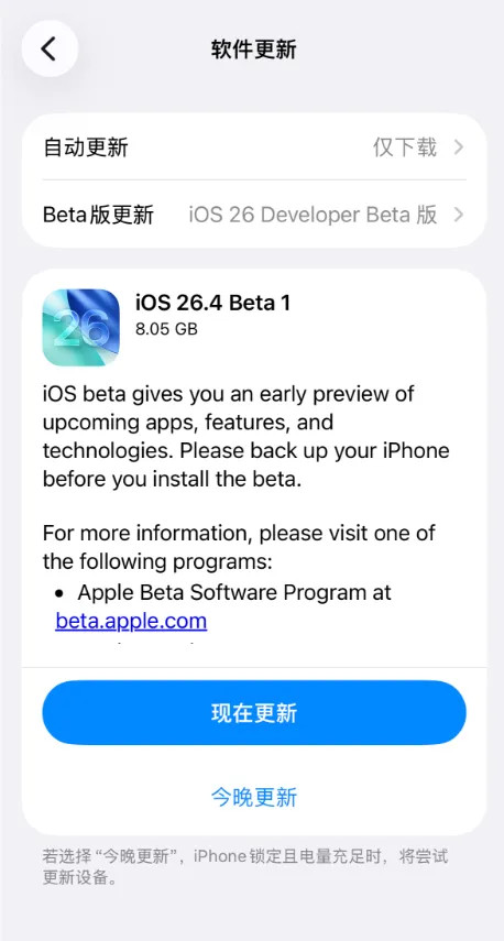 iOS 26.4 Beta 1 的系统版块号23E5207q。