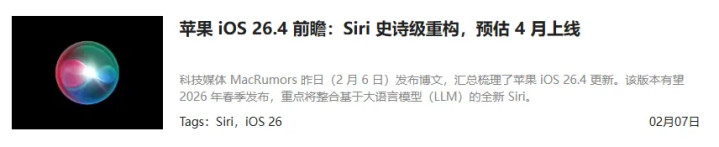 凭证此前坊间神话,升级后的新版 Siri 有望在 iOS 26.4 测试版中上线。