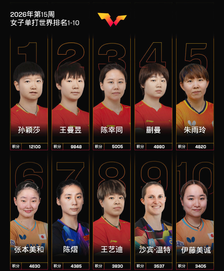 与男单的严峻形式造成昭彰对比的是,女片面中国队依然保抓着盛大的统领力。孙颖莎、王曼昱、陈幸同、蒯曼包揽前四,陈熠位列第七,王艺迪位列第八,前十名中统统占据七席,另有德国选手温特位列第九、伊藤好意思诚第十、张本好意思和第六、朱雨玲第五。
