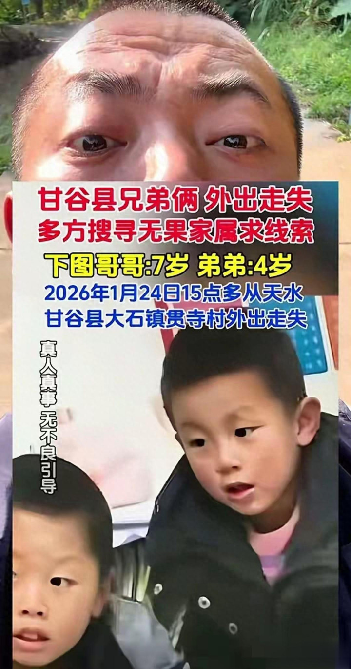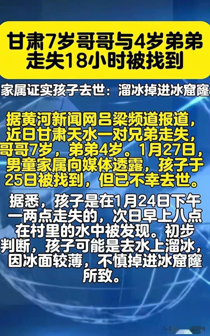 新年寒潮下惊魂一夜,天水某村落1月24日下午发生惨剧。7岁哥哥带4岁弟弟外出玩耍后失联,村里当天就疯传孩子被拐卖。父母发传单找遍田间地头,直到第二天中午才在村西水塘发现异样。