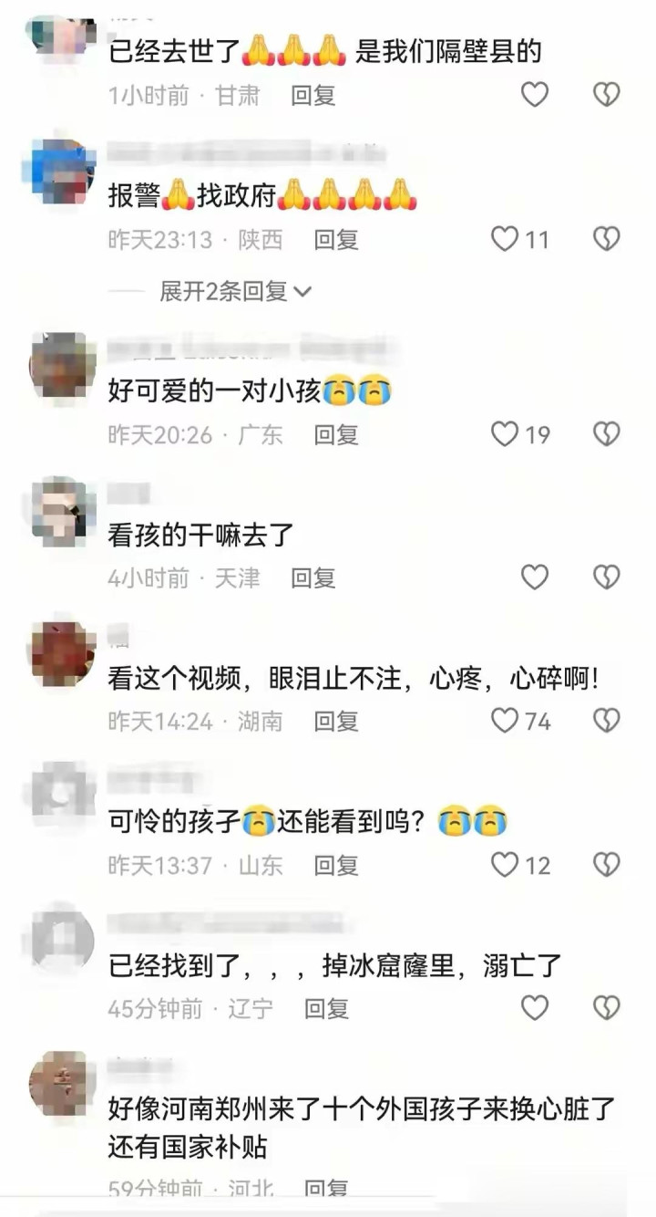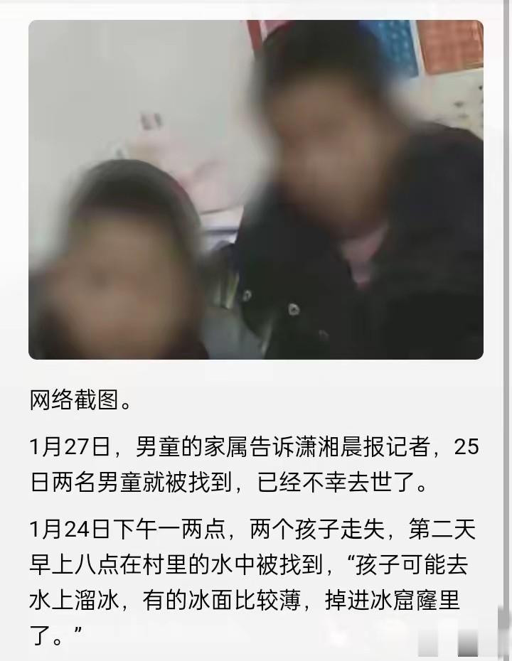 警方监控显示俩娃没出村范围,但茫茫黑夜搜起来费劲。气温零下10度,村民打着电筒在野地里喊了一宿。找到时两个孩子已经没气了,冰面窟窿边还留着他们的棉鞋。目测是踩薄冰落水,但水面结的冰还没冻实,没人想到会出岔子。
