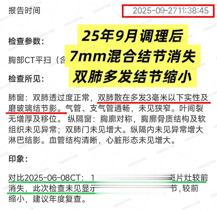 2025年9月27号,他特意打电话过来,声音都透着高兴:刚复查的CT显示,左肺那个7毫米的混合结节没了!双肺的小结节也比之前小了不少,胸廓、纵隔这些地方都没啥问题。