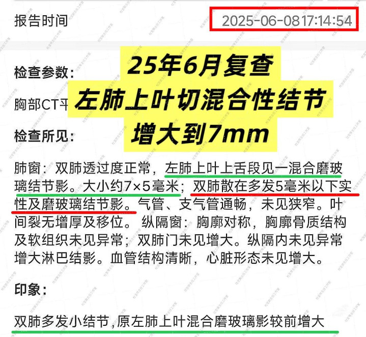 这个患者去年就查出了肺结节,但当时还小就没管,结果到了今年2025年6月8日,患者拿着复查的胸部 CT 报告来找我:左肺上叶上舌段有个7×5毫米的混合磨玻璃结节,双肺还散着好几个5毫米以下的小结节。