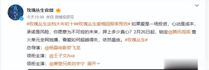 先来捋捋此次定档的完好端倪,2 月 11 日《玫瑰丛生》官微肃肃官宣定档,笃定于大岁首十在腾讯视频、极光 TV 独播,这亦然腾讯视频在春节档拿出的重磅王人市爱情作品。
