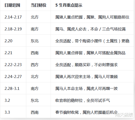逐日财位适配:优先选拔当日财位,其中2.18-2.19南边财位(火局本位)可要点把执,财运浓度翻倍。