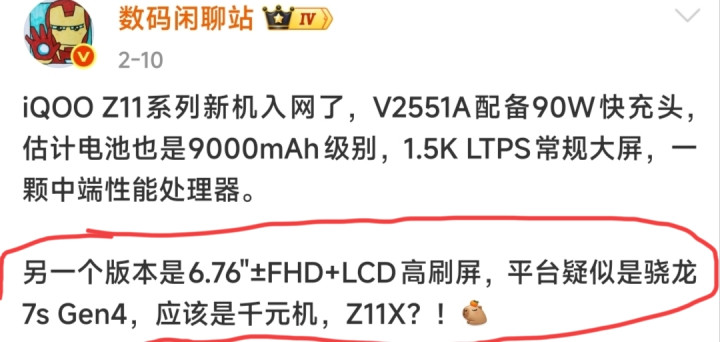 看来中端性能机,又要多一个大电板长续航的机子了。但这并不是我重心情态的场地,主若是念念看曝光得另一款机子,数码博主说有一个高刷屏的LCD新机入彀了,6.76寸屏幕,疑似搭载了一个骁龙7sGen4的解决器,臆度是IQOO Z11X。