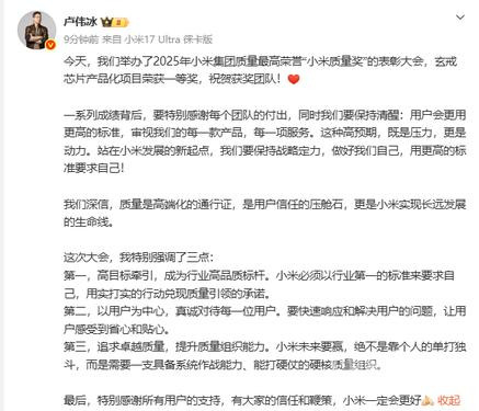 这一成绩的背后,是数百名工程师跨部门、跨周期的协同奋战,更是小米将“质量即信仰”融入研发基因的真实写照。小米集团合伙人、总裁卢伟冰表示:“用户不会因为‘我们很努力’而买单,只会因‘用得放心’而选择长期信任。”