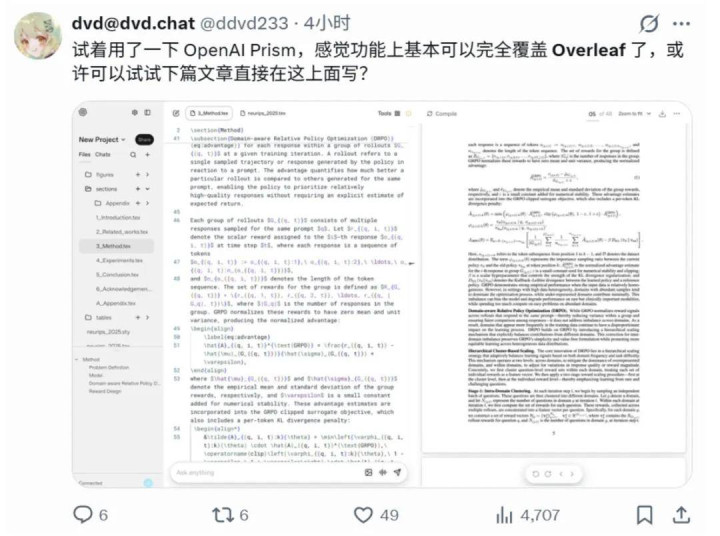 有研究人员在试用后表示,Prism 的功能已基本实现对 Overleaf 的全覆盖,并表示考虑「下篇文章直接在这上面写」。
