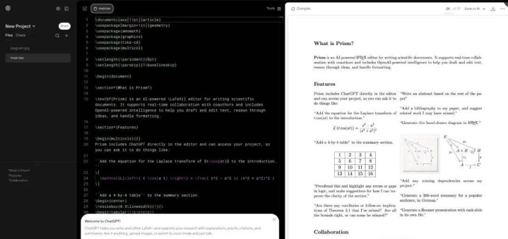 值得注意的是,Prism 并非完全从零开始构建,而是基于云端 LaTeX 平台 Crixet 的基础之上,OpenAI 在收购 Crixet 后,便将其进一步打造成了现在的统一产品 Prism。