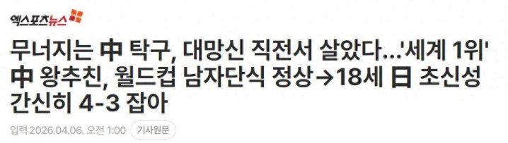 韩国媒体X体育新闻6日称:“中国男乒躲过一场倒霉,但仍让东谈主不由得倒吸一口寒气。男单寰球排行第一的王楚钦活着界杯男单决赛中夺冠,守住了面临垮塌的中国乒乓球尊容。在与2007年降生的日本新星松岛辉空鏖战七局后,王楚钦以4:3(9:11、18:16、11:8、11:13、8:11、11:8、11:8)险胜。他就此拿下个东谈主劳动生计首个寰球杯冠军。”