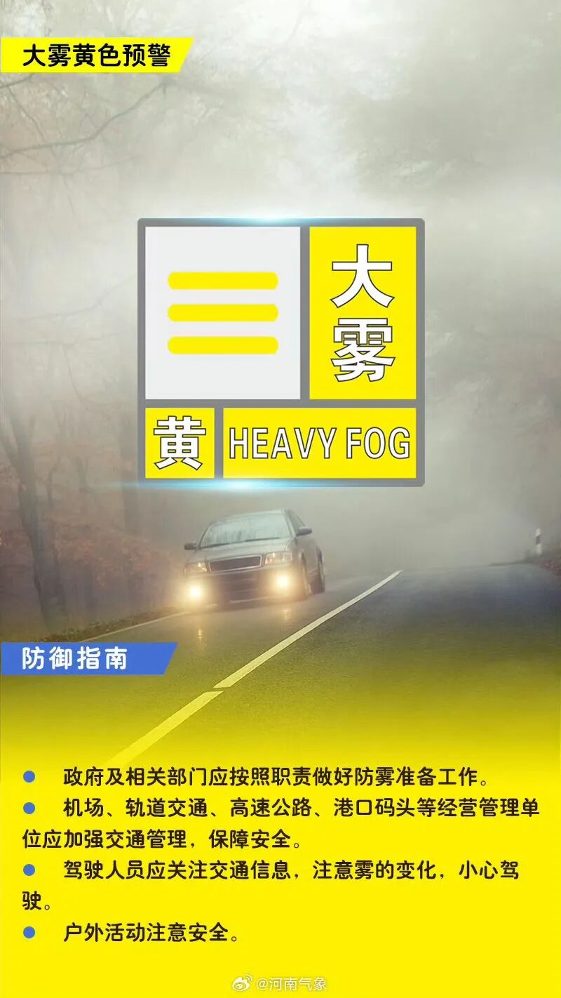 据河南省防灾减灾救灾委员会办公室、河南省应急管理厅消息,2026年1月27日17时,省气象台发布大雾黄色预警:预计27日20时至28日12时,安阳中东部、濮阳、鹤壁、新乡、焦作东部、洛阳东北部、郑州、开封、商丘西部、平顶山、许昌、漯河、周口中西部、南阳东部和南部、驻马店、信阳部分县(市、区)将出现能见度低于500米的浓雾,其中新乡东部、开封南部、许昌东部、漯河东部、周口西部、南阳南部、驻马店东部、信阳北部部分县(市、区)有能见度低于200米的强浓雾,局部能见度低于50米。