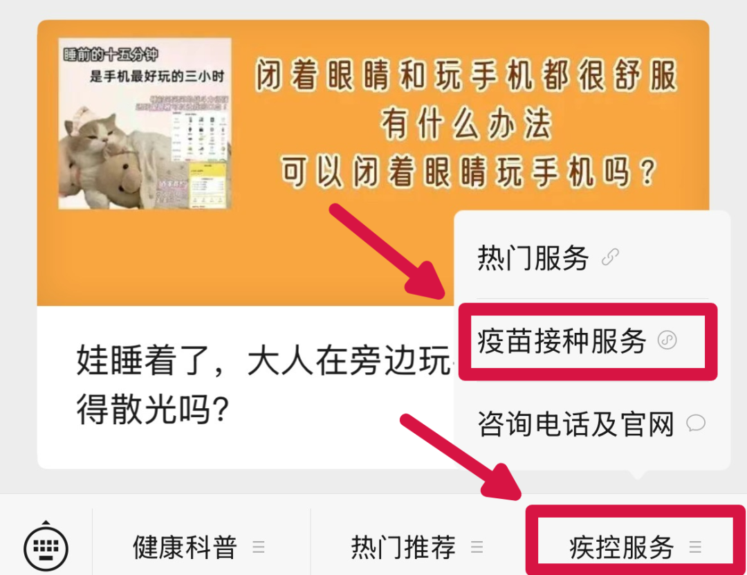 1.进入“广西疾控”微信公众号菜单栏—点击“疾控服务”—点击“疫苗接种服务”。