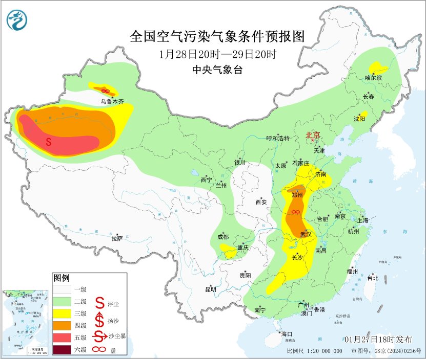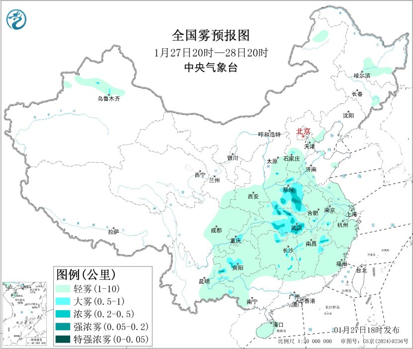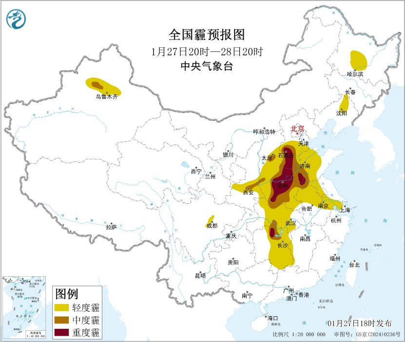 27日夜间至29日,湖北中东部、湖南中北部等地大气扩散条件一般,有轻至中度霾。此外,27日夜间至28日上午,湖北中东部、湖南北部等地的部分地区有大雾,局地有能见度不足200米的强浓雾。