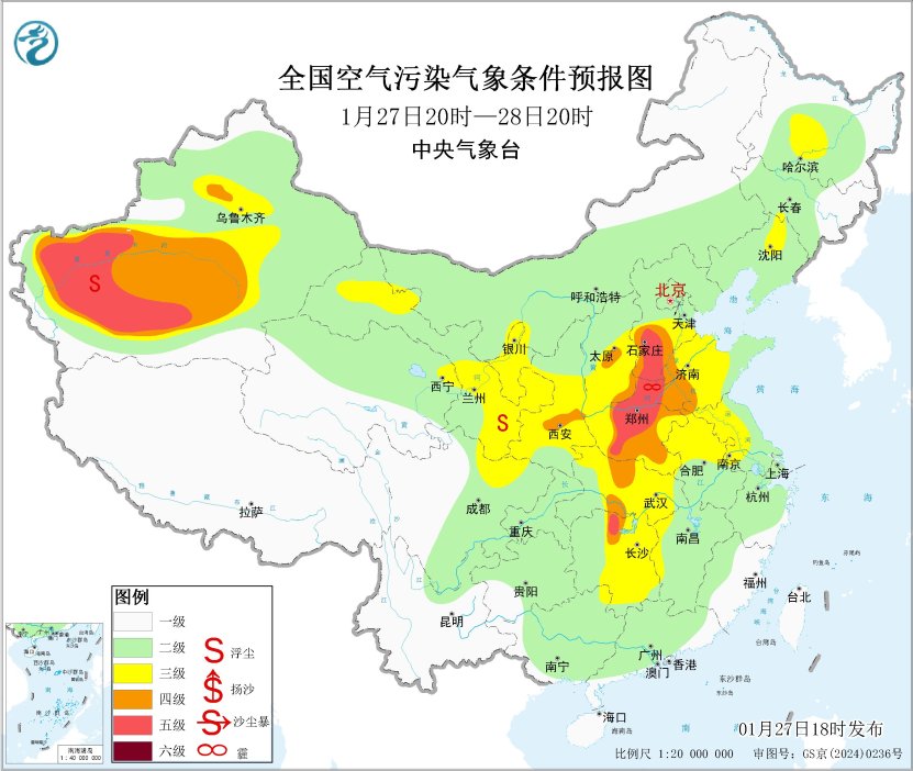 27日夜间至28日,华北中南部、黄淮中西部、汾渭平原、江汉等地大气扩散条件较差,有轻至中度霾,部分地区有重度霾,夜间至早晨时段部分地区有大雾。29日至30日,受冷空气和降水共同影响,上述地区雾、霾天气逐渐减弱或消散。