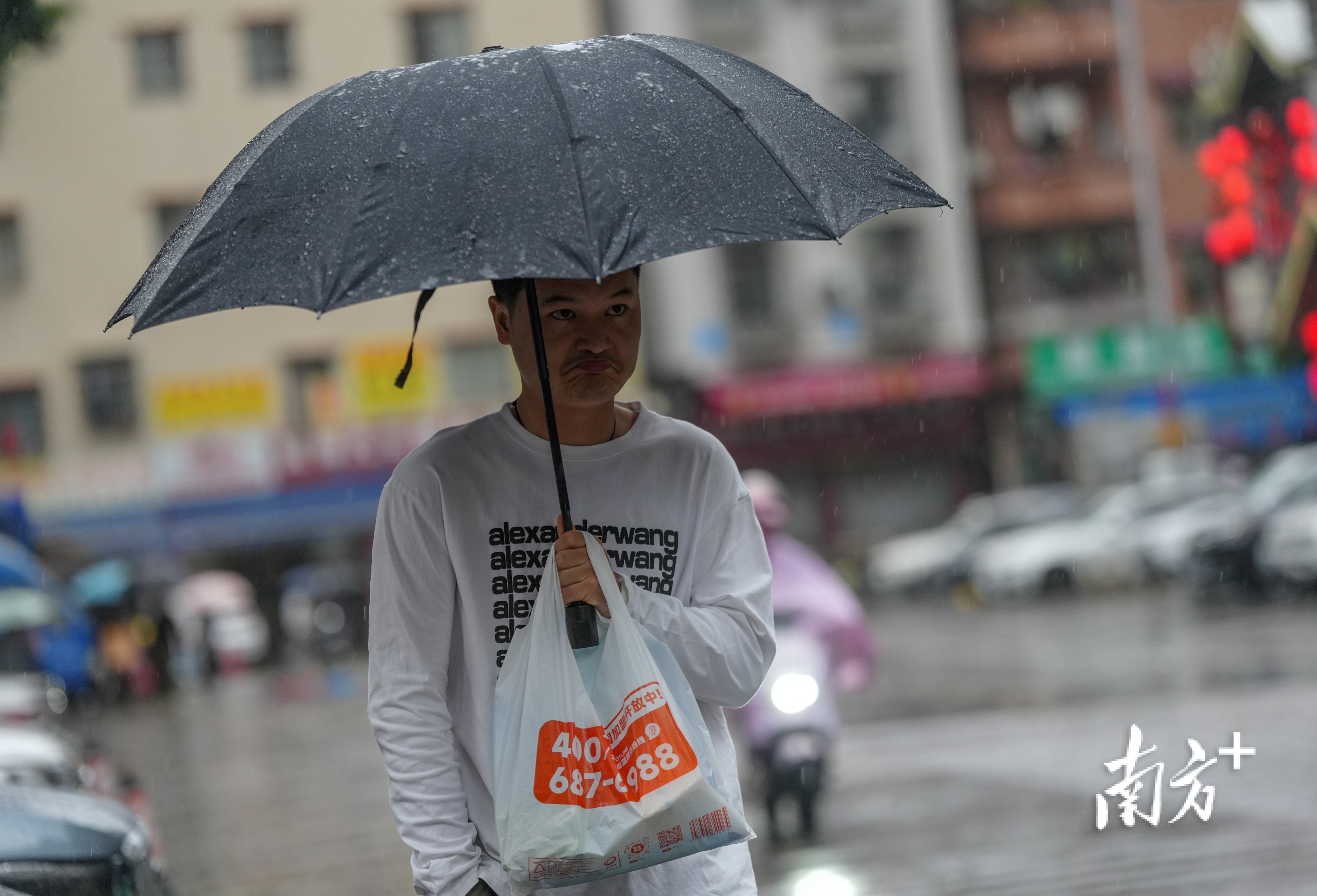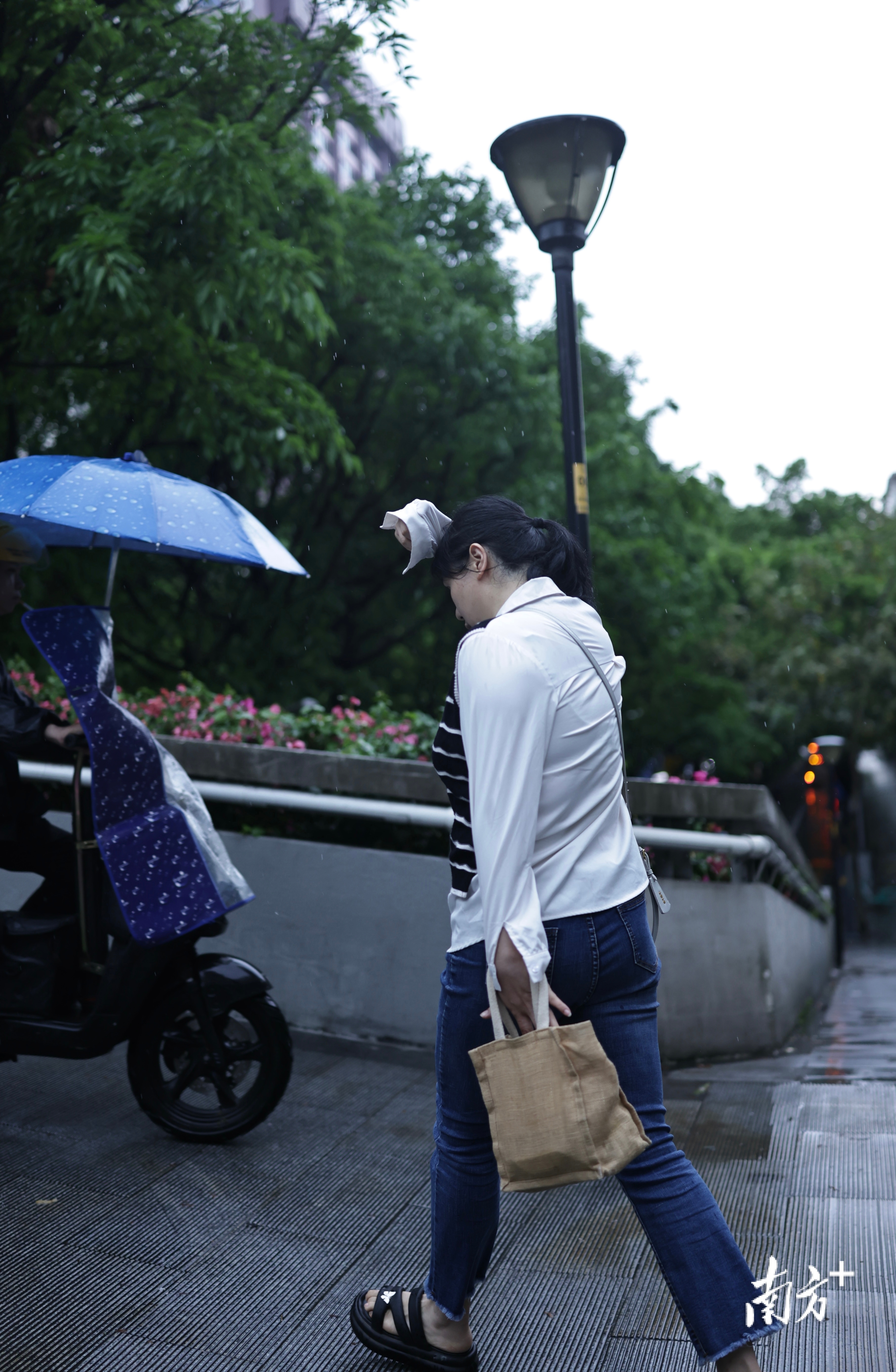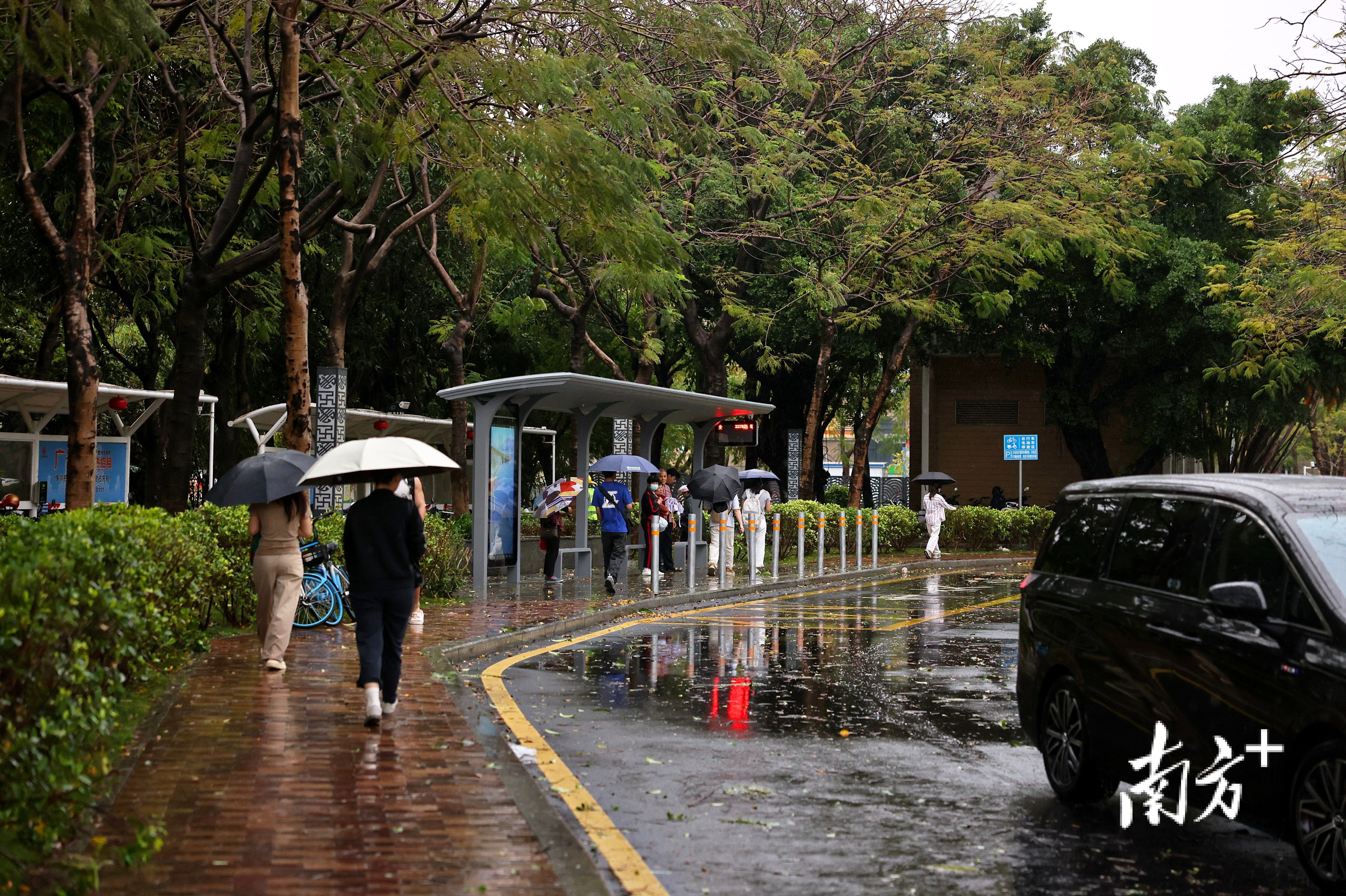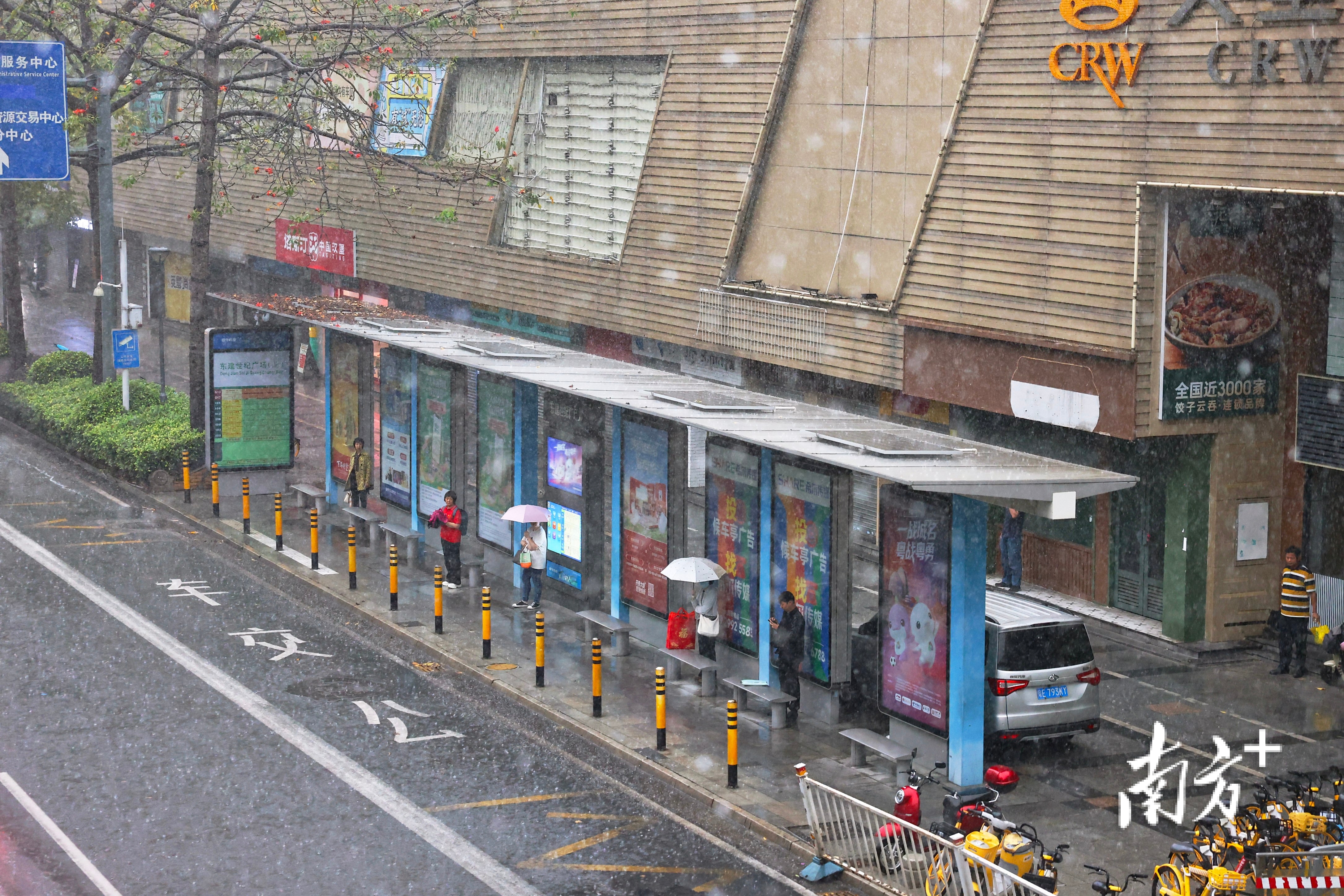 南洲北路上,出其不备的暴雨让莫得带伞的街坊们猝不足防,纷繁在屋檐下避雨等车。