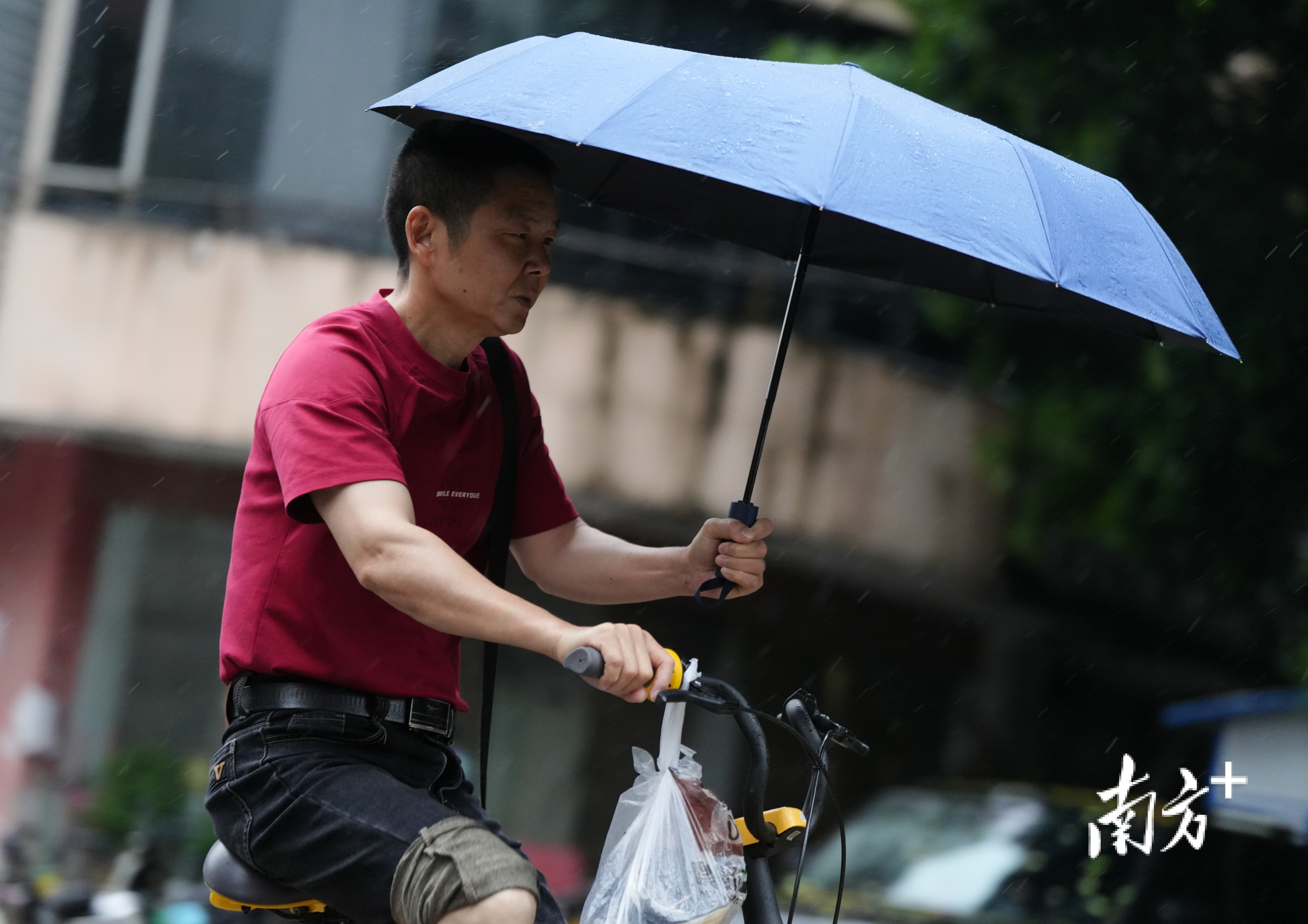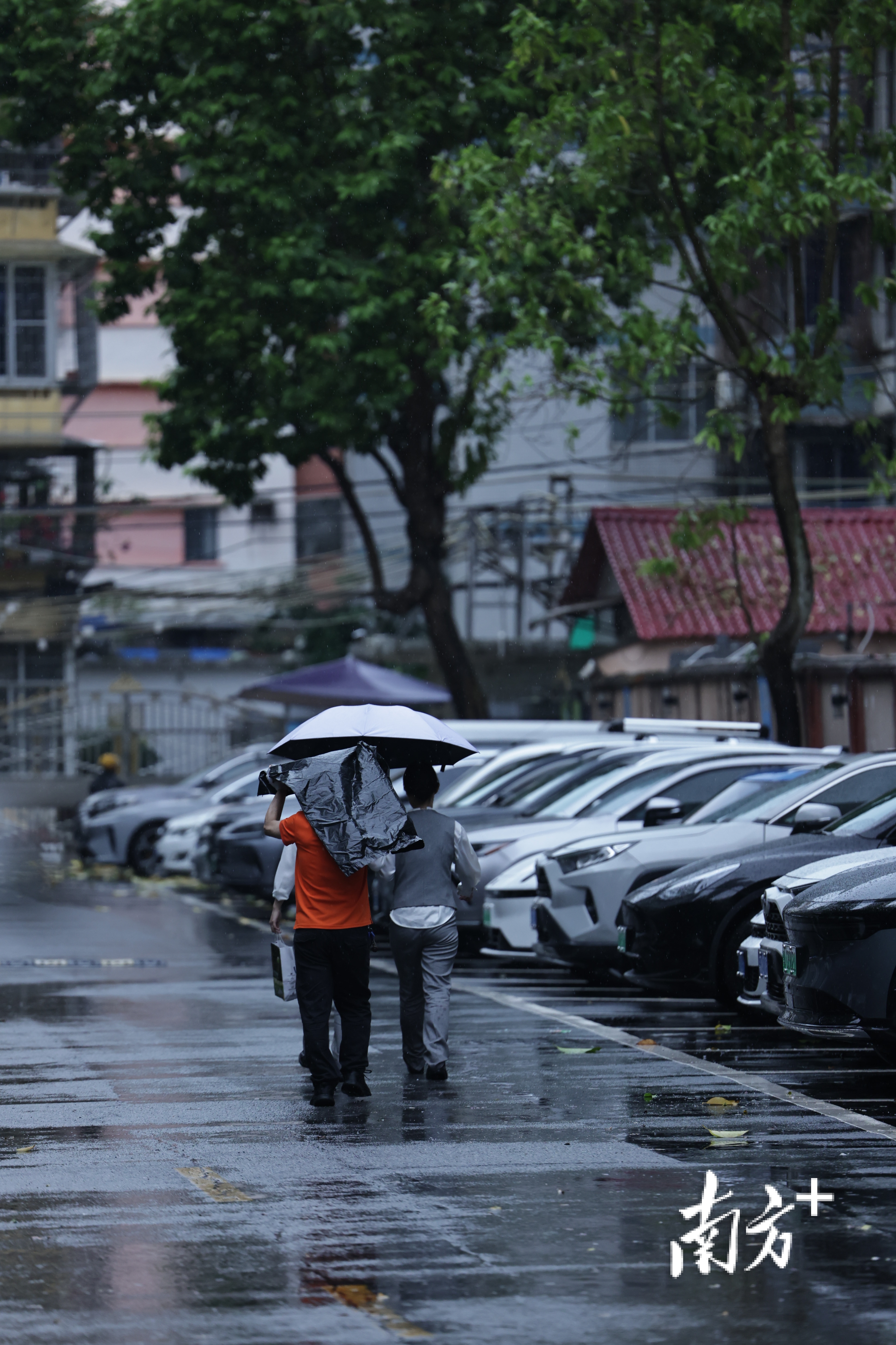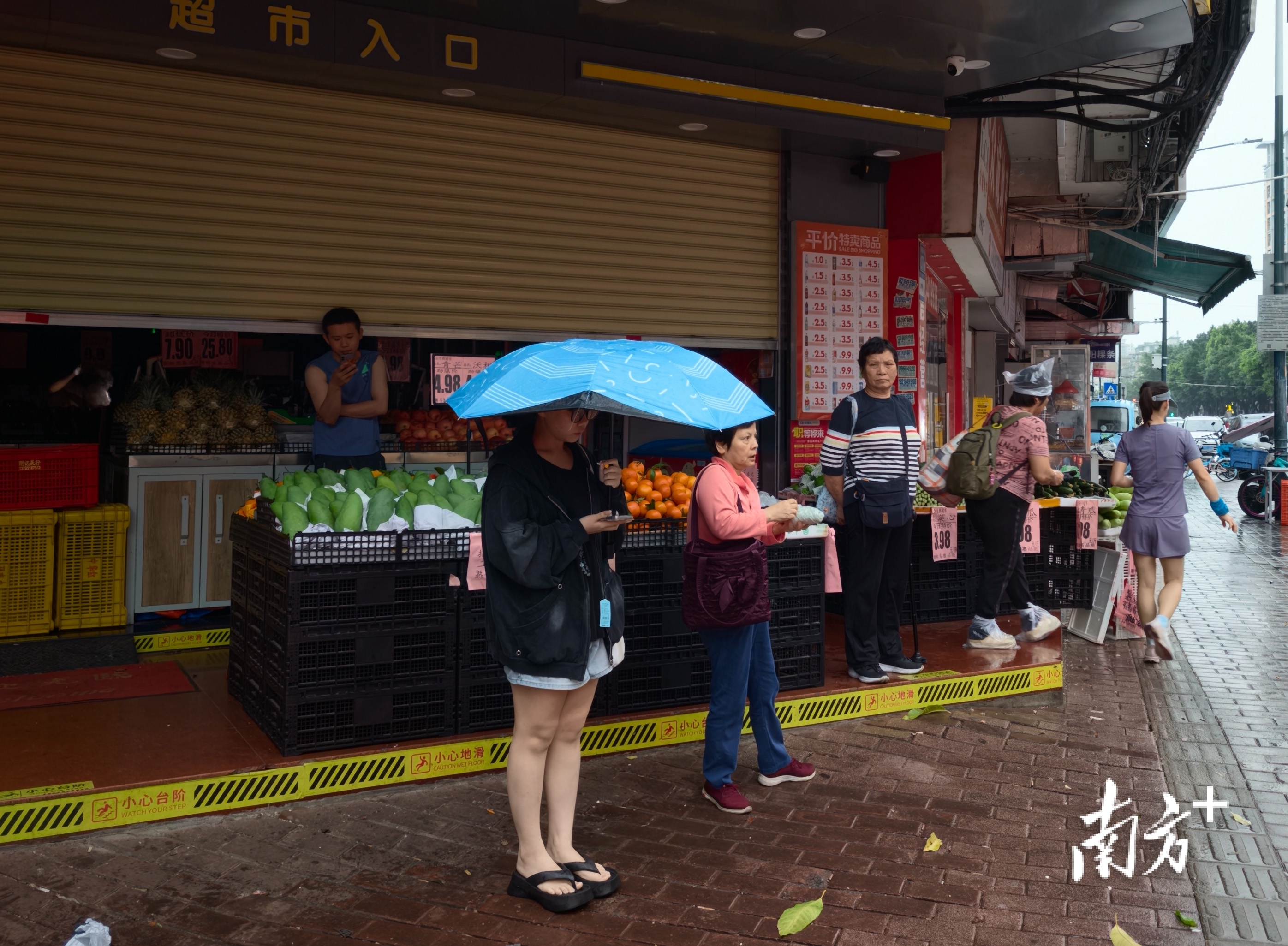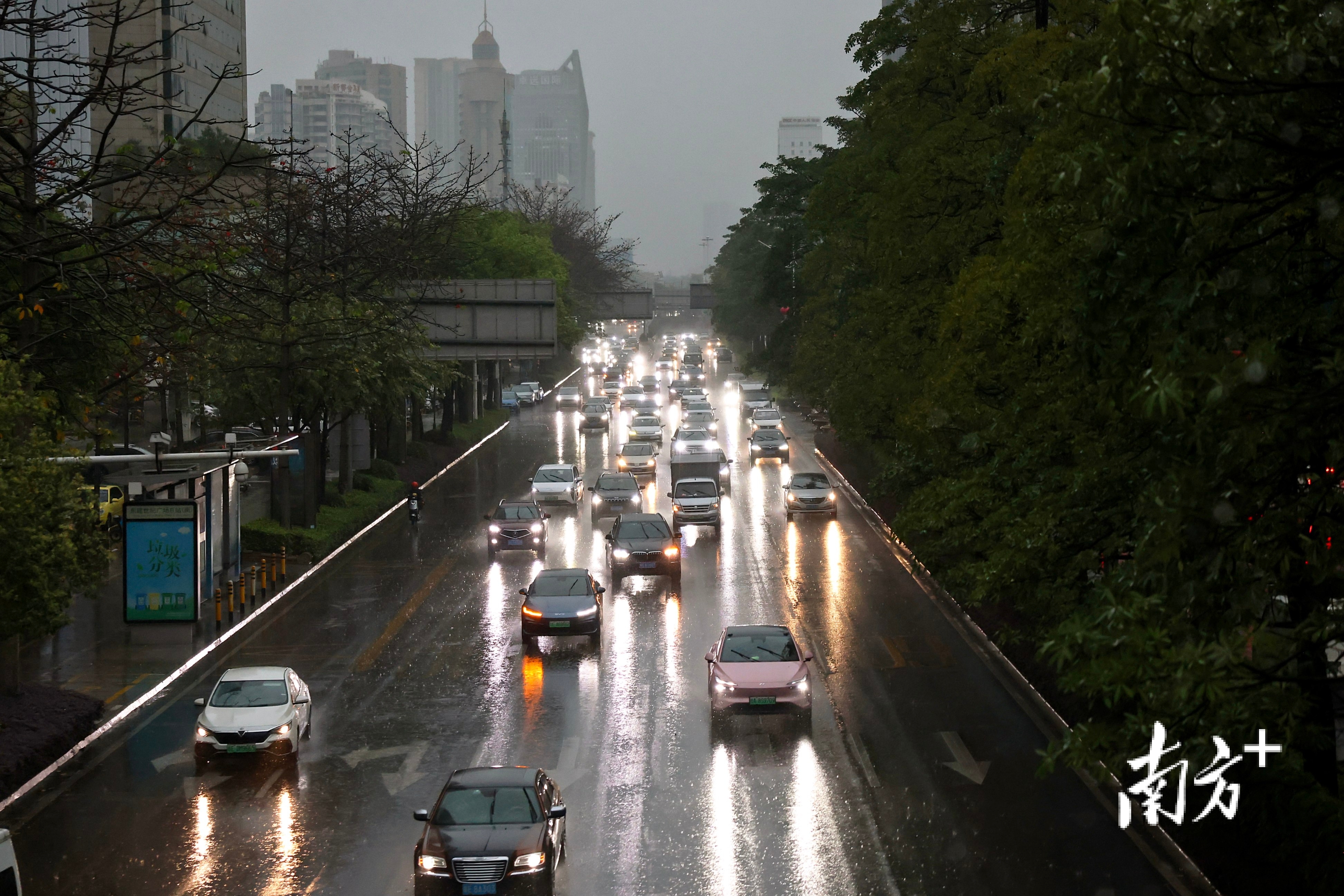 南洲北路上,出其不备的暴雨让莫得带伞的街坊们猝不足防,纷繁在屋檐下避雨等车。