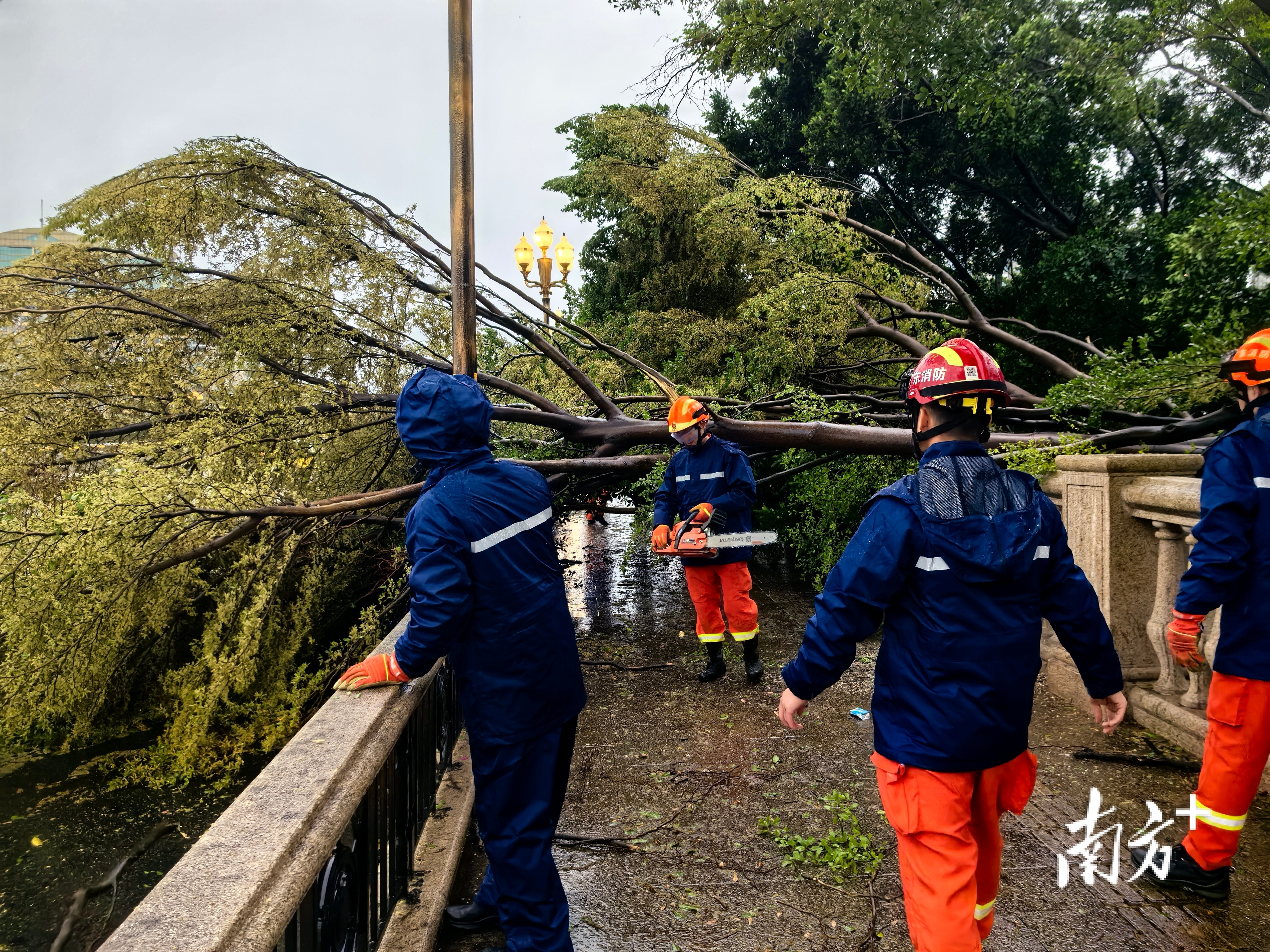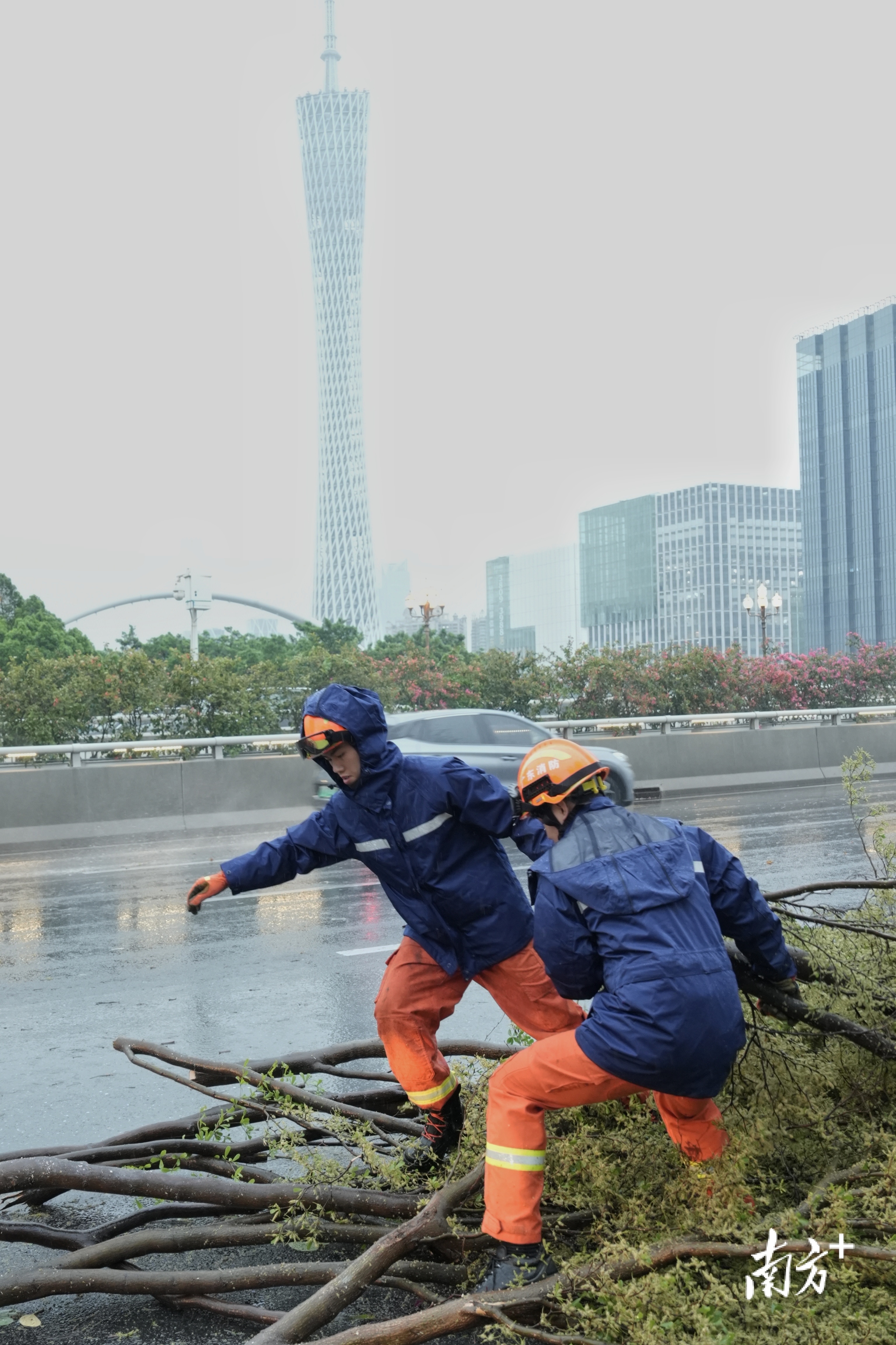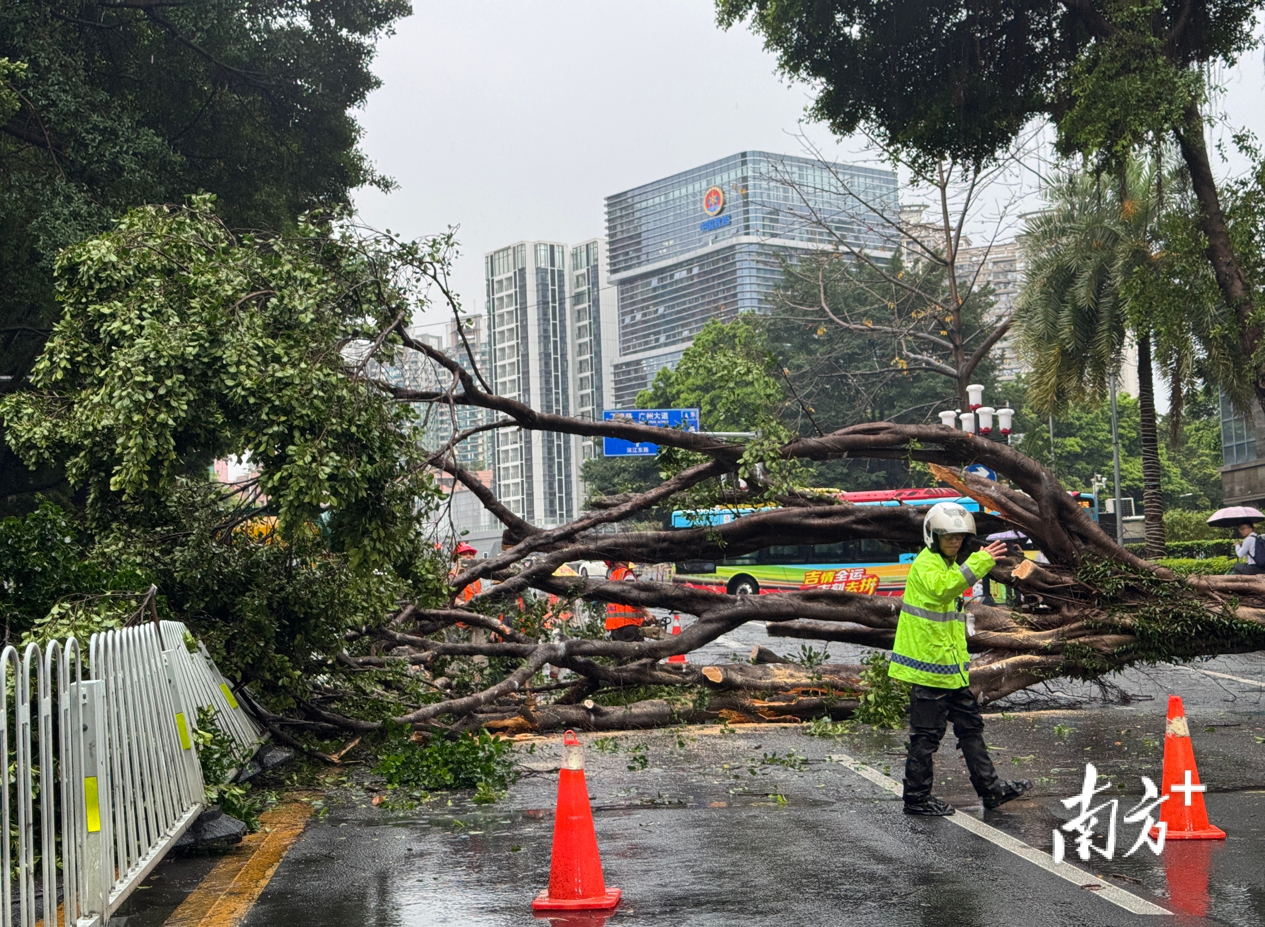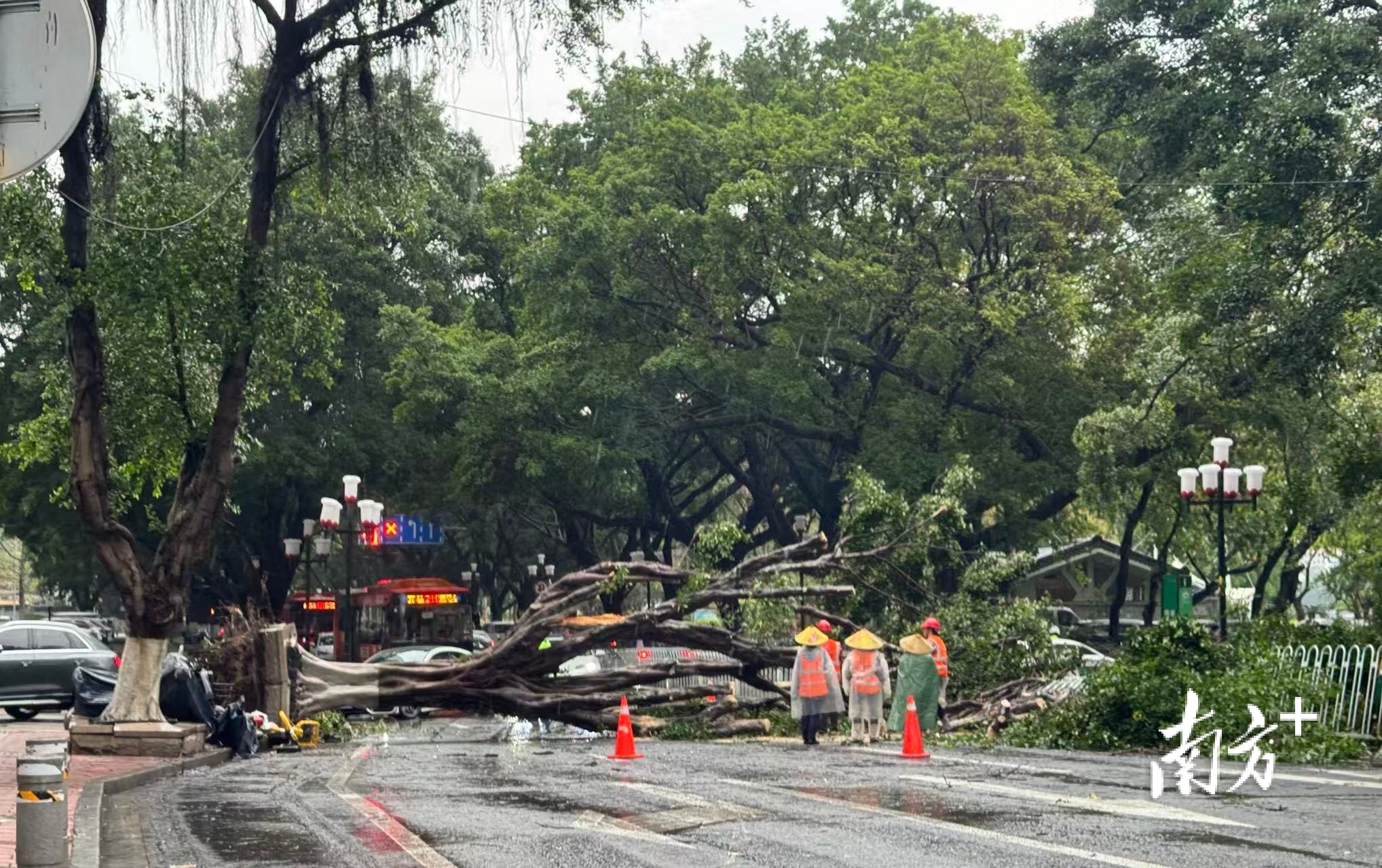 海珠区滨江中路大树倒塌,交警现场指点交通,市政东说念主员速即打消路障。