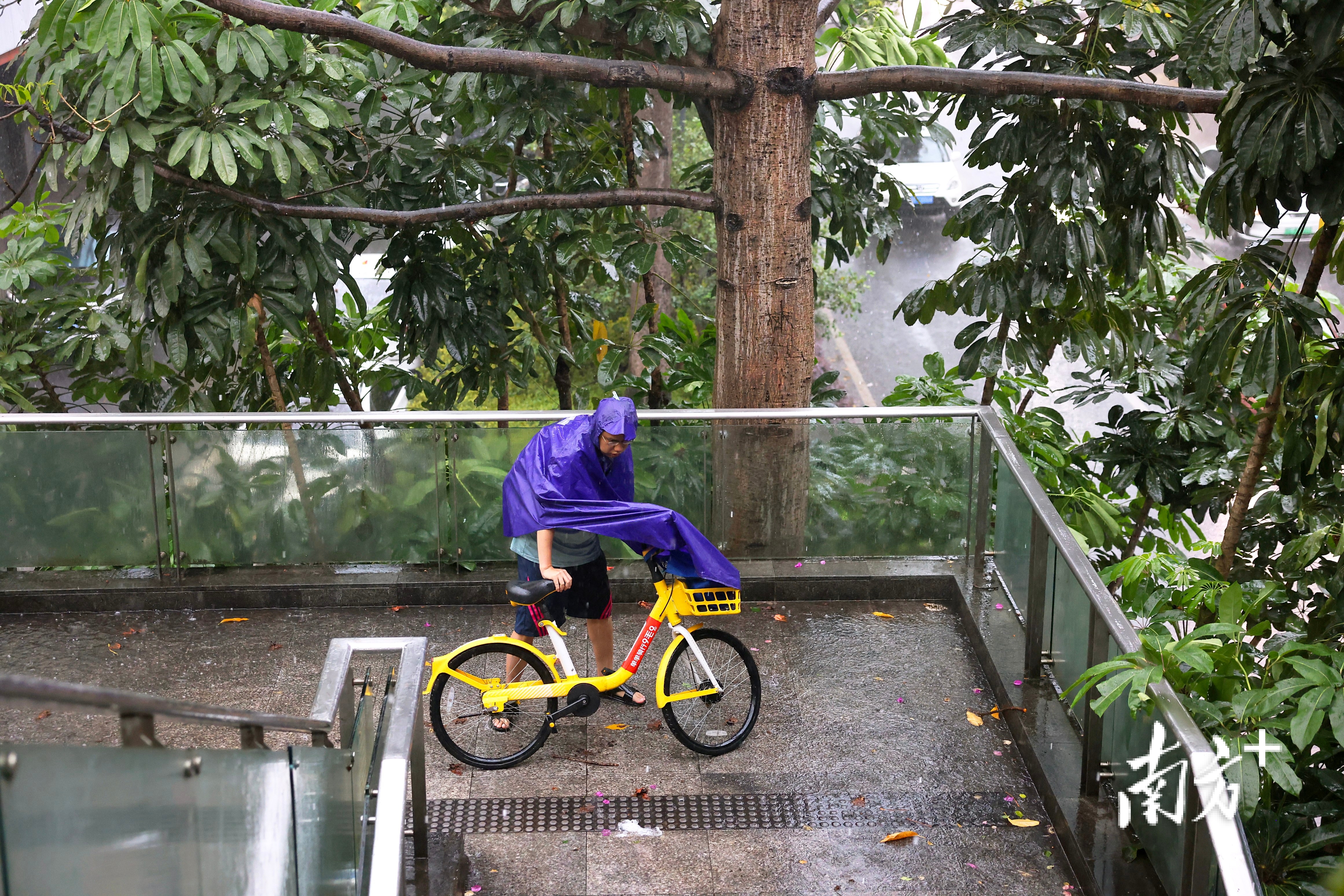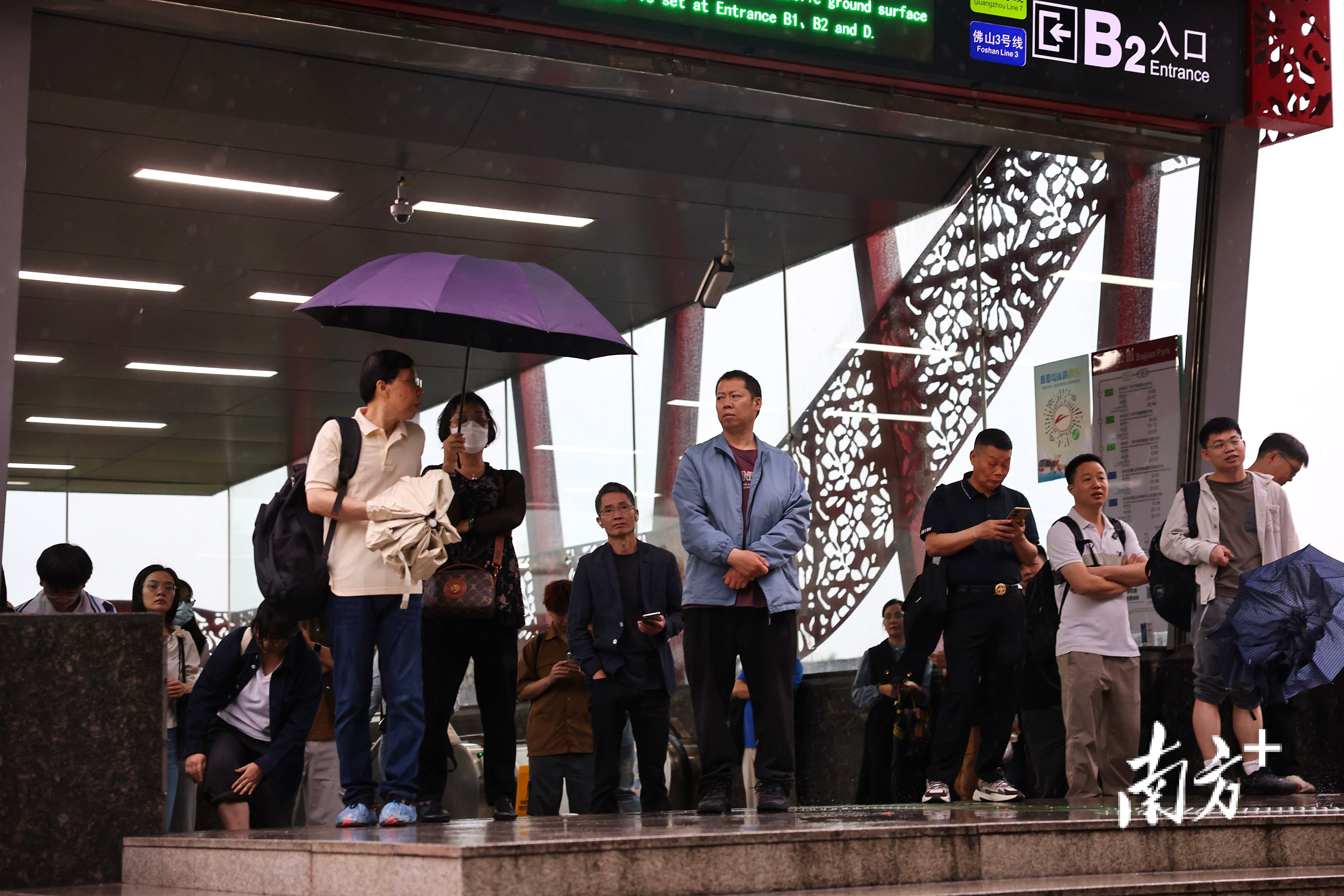 佛山市北滘公园地铁站隔邻,上班市民撑伞出行,不少没带伞的市民在地铁站口恭候。