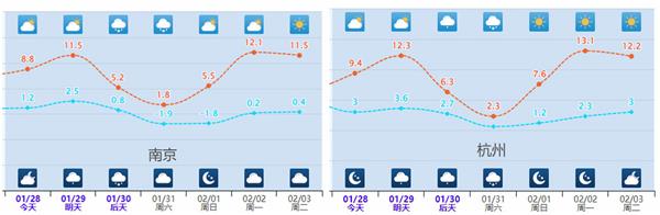 城市中,郑州、合肥、武汉、南京、杭州、长沙最高气温将从10℃左右下降到5℃或以下。