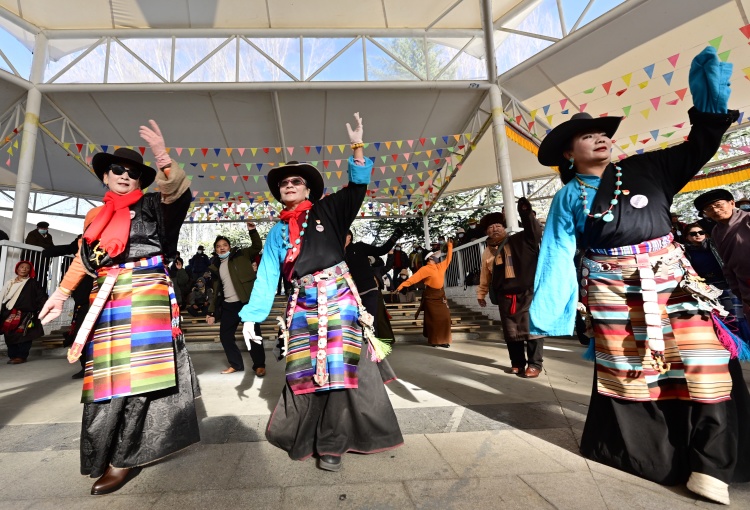 群众在拉萨宗角禄康公园跳锅庄舞。记者 旦增兰泽 唐斌 索朗旺久 摄