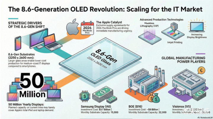 咱们还是报说念了许屡次8.6代AMOLED产线,同期先容了目前几家正在开辟8.6代AMOLED产线的企业。仅仅许多东说念主不解白8.6代AMOLED产线到底是什么真理,为什么厂商宁可花上数百亿元也要打造这样的产线。是以今天咱们也来节略聊聊这个事儿,天然领先可以坚信的是,改日要快速全面普及OLED面板,那么8.6代AMOLED产线果然是一个必须的身分。