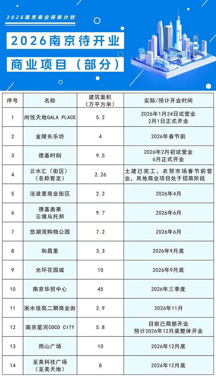据南京市商务局不完全统计,2026年南京新开商业项目总体量超100万方。