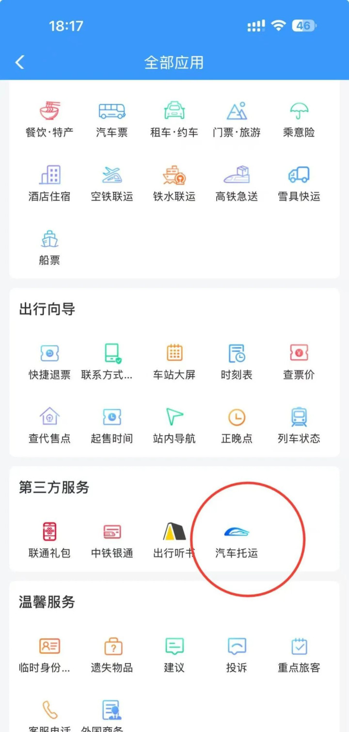 近期,中国铁路新增多条汽车托运线路,为有长途自驾需求的旅客提供更多的出行选择。打开铁路12306APP,在应用栏向左滑动,进入全部应用界面,找到第三方服务,点击汽车托运,跳转至国铁汽车托运程序。