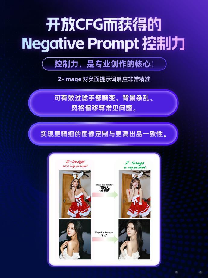 Z-Image 还支持极高灵敏度的负向提示词响应, 赋予创作者指挥家般的调度权,通过 Negative Prompt 快速过滤瑕疵、净化画面,实现从构图到光影的深度掌控。